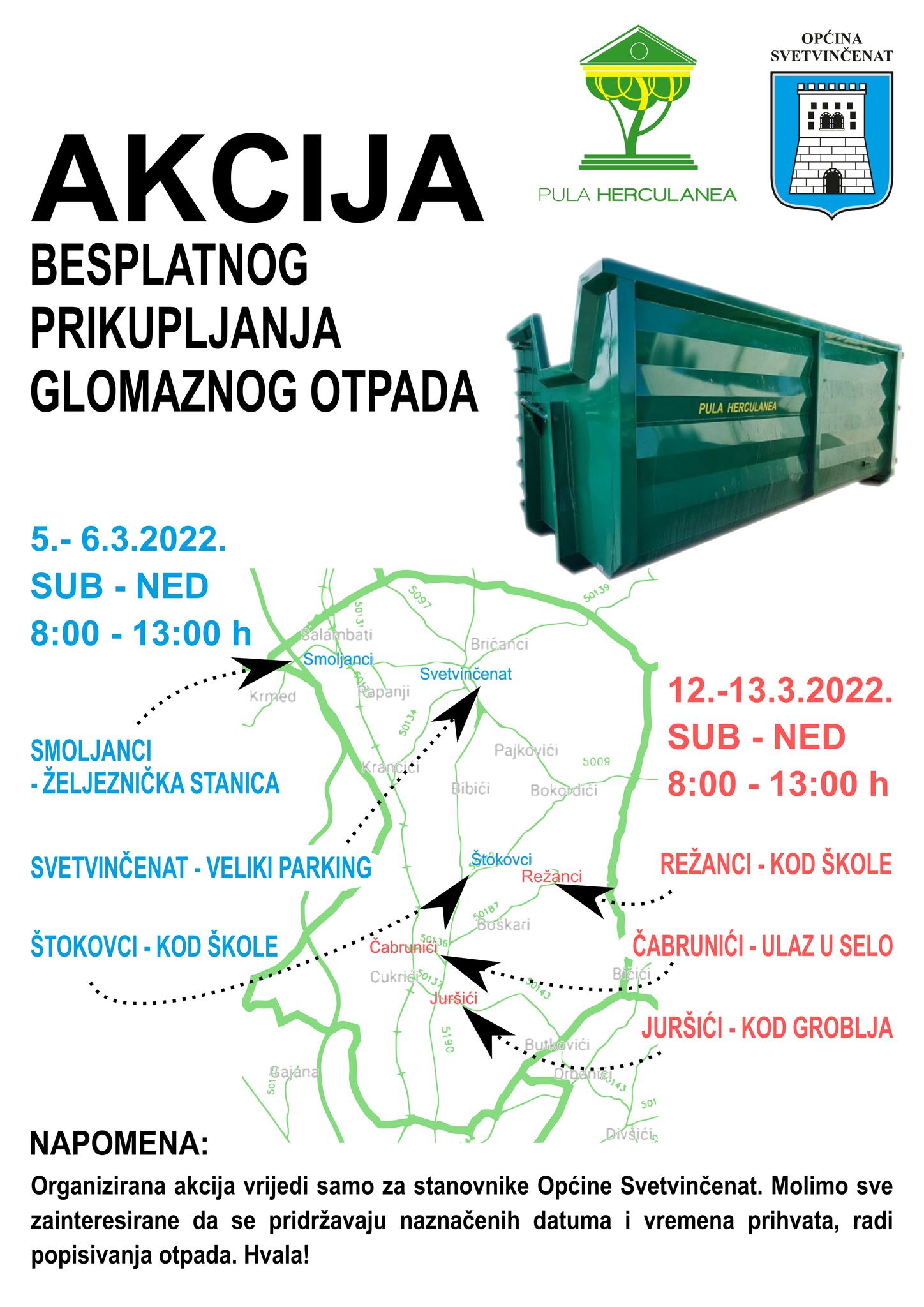 U subotu i nedjelju, 05. i 06. ožujka, od 8.00 do 13.00 sati može se donijeti glomazni otpad na predviđene lokacije u naseljima Svetvinčenat, Smoljanci i Štokovci, dok su za subotu i nedjelju, 12. i 13. ožujka, od 8.00 do 13.00 sati za prikupljanje glomaznog otpada predviđene lokacije u naseljima Režanci, Čabrunići i Juršići.